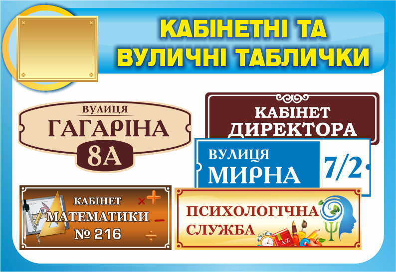 У кожній школі, коледжі чи університеті важливо створити місце шани та вдячності — простір, де учні та педагоги вшановують тих, хто захищає нашу країну. Саме для цього створена композиція стендів “Місце шани та вдячності”, що стає центром патріотичного виховання молоді. Комплект стендів-вказівників для укриттяСучасні реалії вимагають, щоб кожен заклад освіти, підприємство чи організація мали чітку систему навігації та інформаційні матеріали для швидкого орієнтування у разі небезпеки. Комплект стендів-вказівників для укриття — це не просто набір табличок, а комплексне рішення, яке допомагає рятувати життя. Оформлення шкільних кабінетів стендами — естетика та функціональність в освітіЯкісне оформлення шкільних кабінетів стендами — це не лише про красу, а й про зручність у навчальному процесі. Грамотно підібраний комплект стендів для оформлення кабінету хімії або комплект стендів для оформлення кабінету математики допомагає учням краще засвоювати інформацію, а вчителю — ефективніше її подавати. Пластикові кишені для стендів — надійне рішення для навчальних закладівЯкщо вам потрібні пластикові кишені для стендів у школу, садочок чи коледж — ви потрапили за адресою. Ми виготовляємо кишеньки на замовлення будь-яких форматів: А4, А5, А6, вертикальні, горизонтальні, плоскі або обʼємні. Вони ідеально підходять для інформаційних стендів, таблиць, планів евакуації, графіків чергувань. Купити кишені недорого від виробника — без переплат. Матеріал — прозорий пластик або акрил, залежно від потреб замовника. Замовляючи у нас, ви отримуєте точні розміри, гарну якість та швидке виготовлення. Оформіть замовлення онлайн або зв'яжіться з нами для консультації. Не відкладайте – замовляйте вже сьогодні на stend-osvita.com, або телефонуйте за номером: 095-755-36-05.