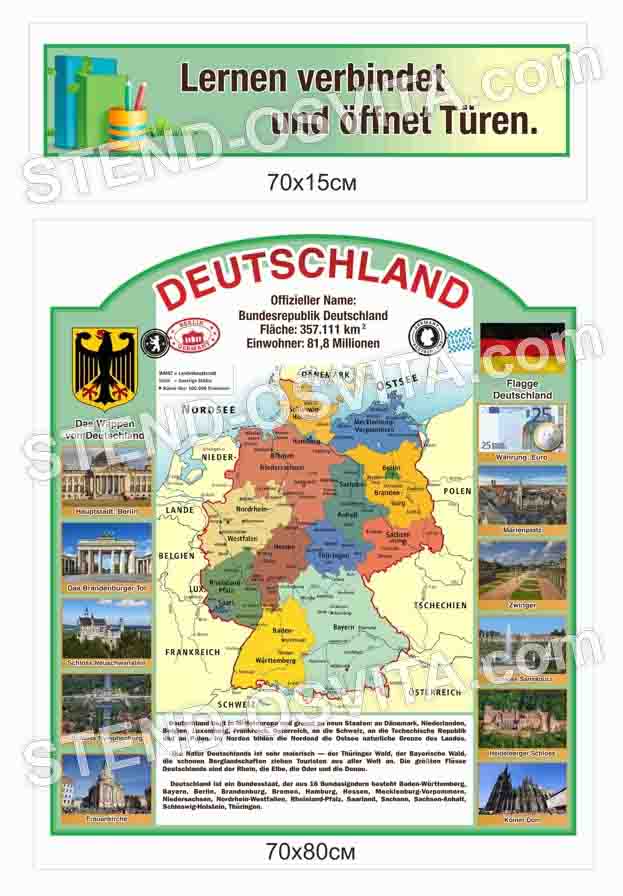 Стенд в кабінет німецької мови Код С1410, загальний розмір 70 х 95 см, ціна 1230 грн Інформаційний стенд «Deutschland» для кабінету німецької мови призначений для візуалізації країнознавчого матеріалу та створення автентичного мовного середовища під час освітнього процесу. Головною метою стенду є формування соціокультурної компетенції учнів через ознайомлення з політико-адміністративним устроєм, державною символікою та визначними архітектурними пам'ятками Федеративної Республіки Німеччина. Завдяки детальному картографічному зображенню федеральних земель, супроводжуваному статистичними даними про площу, населення та найбільші міста, стенд слугує ефективним наочним посібником для вивчення географії та державного ладу країни, мова якої вивчається. Візуалізація таких знакових об'єктів, як Бранденбурзькі ворота, замок Нойшванштайн та Кельнський собор, у поєднанні з інформацією про національну валюту та державні символи, сприяє підвищенню мотивації до навчання, розширенню кругозору школярів та забезпечує естетичне оформлення навчального кабінету згідно з сучасними освітніми стандартами. Якісні стенди ✅ Стенди на замовлення ✅ Доставка стендів по Україні ✅ Низькі ціни ✅ Тільки якісні та безпечні матеріали Матеріали: Стенди з ПВХ 4мм або ПВХ 3мм, на вибір. Покриті плівкою Oracal найвищої якості. Кишені виготовляються з прозорого пластику, який є довговічним та не змінює колір. Безкоштовно вносимо корективи: За дизайном, кольором, формою та наповненням стендів. Індивідуальна розробка стендів за Вашими побажаннями! Способи кріплення: За допомогою спеціальних цвяхів. Кріплення надається разом зі стендами безкоштовно. Також стенди можна кріпити за допомогою саморізів, швидкого мантажу, вушки та петельки (в комплект не входять). Додаткові послуги: · обрамлення молдингом (декоративна золота чи срібляста стрічка по периметру); · ламінування (покриття захисною антивандальною плівкою); · встановлення люверсів (металеві кільця для кріплення); · встановлення вушок-кріплень (з підклейкою); · обрешітка (додаткове упакування для безпечного транспортування великих стендів). Гарантія: Ми надаємо гарантію на всю продукцію терміном 1 рік. Потрібен чек? Скажіть про це менеджеру при оформленні замовлення і ми надішлемо Вам документацію разом зі стендами. Щоб купити, замовити стенди для оформлення кабінету німецької мови, натисніть кнопку «Купити», щоб оформити замовлення на сайті або зателефонуйте: 095-755-36-05, 068-994-98-39. Доставка стендів здійснюється поштовими службами у будь-який куточок України: Вугледар, Біла Церква, Бердянськ, Велика Олександрівка, Берегово, Бережани, Бориспіль, Бровари, Васильків, Вінниця, Глухів, Кам'янське, Білгород-Дністровський, Дніпро, Дрогобич, Дубляни, Бахмут, Жовті Води, Муровані Курилівці, Житомир, Запоріжжя, Івано-Франківськ, Ізмаїл, Чорноморськ, Косів, Ірпінь, Богодухів, Кам'янець-Подільський, Київ, Коломия, Косів, Покровськ, Краматорськ, Краснодон, Кременець, Чорноморівка, Кременчук, Шаргород, Вільногірськ, Міжгір'я, Кривий Ріг, Луцьк, Львів, Луганськ, Мала Данилівка, Мукачево, Ніжин, Миколаїв, Нікополь, Нова Каховка, Вознесенськ, Ананьєв, Одеса, Острог, Павлоград, Первомайськ, Переяслав-Хмельницький, Дачне, Полтава, Рені, Рівне, Рубіжне, Сєвєродонецьк, Славутич, Слов'янськ, Заброди, Суми, Тернопіль, Березань, Токмак, Ужгоро