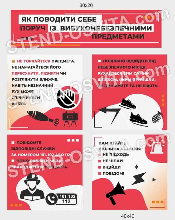 Стенд модульний "Як поводити себе поруч із вибухонебезпечними предметами" Код С1388, загальний розмір 80х100 см, ціна 1480 грн Якісні стенди ✅ Стенди на замовлення ✅ Доставка стендів по Україні ✅ Низькі ціни ✅ Тільки якісні та безпечні матеріали Матеріали: Стенди з ПВХ 4мм або ПВХ 3мм, на вибір. Покриті плівкою Oracal найвищої якості. Кишені виготовляються з прозорого пластику, який є довговічним та не змінює колір. Безкоштовно вносимо корективи: За дизайном, кольором, формою та наповненням стендів. Індивідуальна розробка стендів за Вашими побажаннями! Способи кріплення: За допомогою спеціальних цвяхів. Кріплення надається разом зі стендами безкоштовно. Також стенди можна кріпити за допомогою саморізів, швидкого мантажу, вушки та петельки (в комплект не входять). Додаткові послуги: · обрамлення молдингом (декоративна золота чи срібляста стрічка по периметру); · ламінування (покриття захисною антивандальною плівкою); · встановлення люверсів (металеві кільця для кріплення); · встановлення вушок-кріплень (з підклейкою); · обрешітка (додаткове упакування для безпечного транспортування великих стендів). Гарантія: Ми надаємо гарантію на всю продукцію терміном 1 рік. Потрібен чек? Скажіть про це менеджеру при оформленні замовлення і ми надішлемо Вам документацію разом зі стендами. Щоб купити, замовити стенд для оформлення куточка безпеки, натисніть кнопку «Купити», щоб оформити замовлення на сайті або зателефонуйте: 095-755-36-05, 068-994-98-39. Доставка стендів здійснюється поштовими службами у будь-який куточок України: Вугледар, Біла Церква, Бердянськ, Велика Олександрівка, Берегово, Бережани, Бориспіль, Бровари, Васильків, Вінниця, Глухів, Кам'янське, Білгород-Дністровський, Дніпро, Дрогобич, Дубляни, Бахмут, Жовті Води, Муровані Курилівці, Житомир, Запоріжжя, Івано-Франківськ, Ізмаїл, Чорноморськ, Косів, Ірпінь, Богодухів, Кам'янець-Подільський, Київ, Коломия, Косів, Покровськ, Краматорськ, Краснодон, Кременець, Чорноморівка, Кременчук, Шаргород, Вільногірськ, Міжгір'я, Кривий Ріг, Луцьк, Львів, Луганськ, Мала Данилівка, Мукачево, Ніжин, Миколаїв, Нікополь, Нова Каховка, Вознесенськ, Ананьєв, Одеса, Острог, Павлоград, Первомайськ, Переяслав-Хмельницький, Дачне, Полтава, Рені, Рівне, Рубіжне, Сєвєродонецьк, Славутич, Слов'янськ, Заброди, Суми, Тернопіль, Березань, Токмак, Ужгород, Умань, Харків, Херсон, Хмельницький, Черкаси, Чернігів, Чернівці, Шостка, Барвінкове, Коростишів, Куп'янськ, Машівка, Самгородок, Хуст, Новоукраїнка, Гола Пристань, Арциз, Авдіївка, Красноград, Ракошино, Новоград-Волинський, Роздільна, Троїцьке, Гайсин, Торецьк, Щастя, Велика Лепетиха і т.д. |